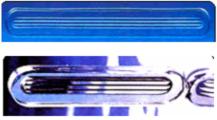 This type of level gauge features several parallel grooves cut into the glass surface that is in contact with the liquid. The resulting primatic differaction caused gases to appear white by reflection: liquids black by absorption. Thus, the level of even transparent liquids can be clearly observed.