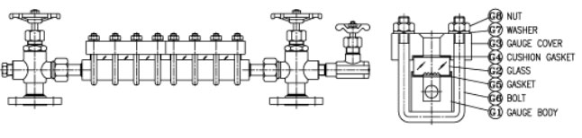 The reflex liquid level gauge has a sturdily constructed body, with the glass and cover securely held by U-bolts to maintain a hermetic seal.